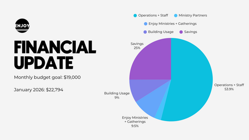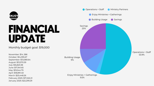 The graphic below is updated regularly. If you would like to financially support the mission of Enjoy Church, you can do so here.